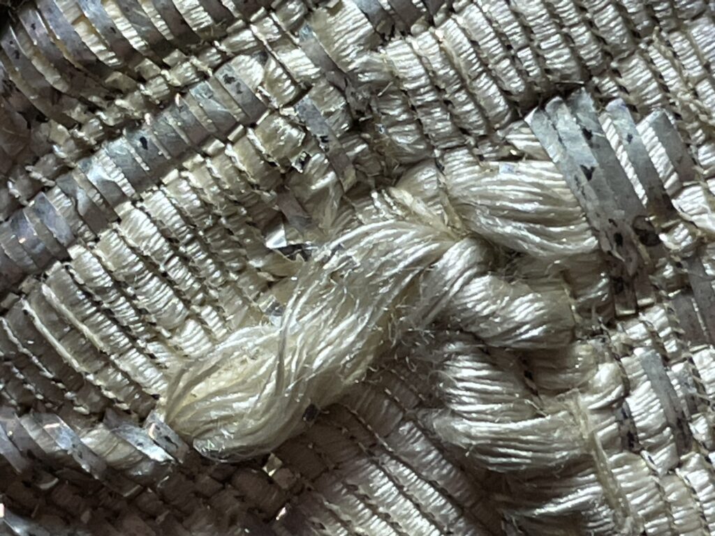 Tekstiilikonservaattori katsoo kohdetta hyvin läheltä. Kuvassa 1800-luvun messukasukan koristenauhaa.